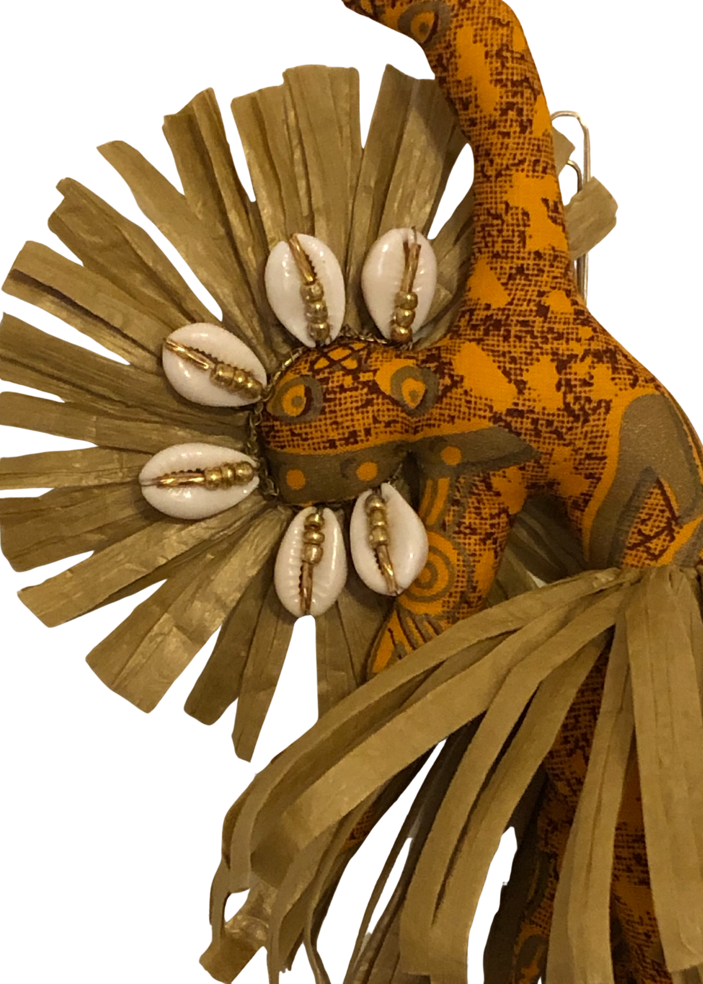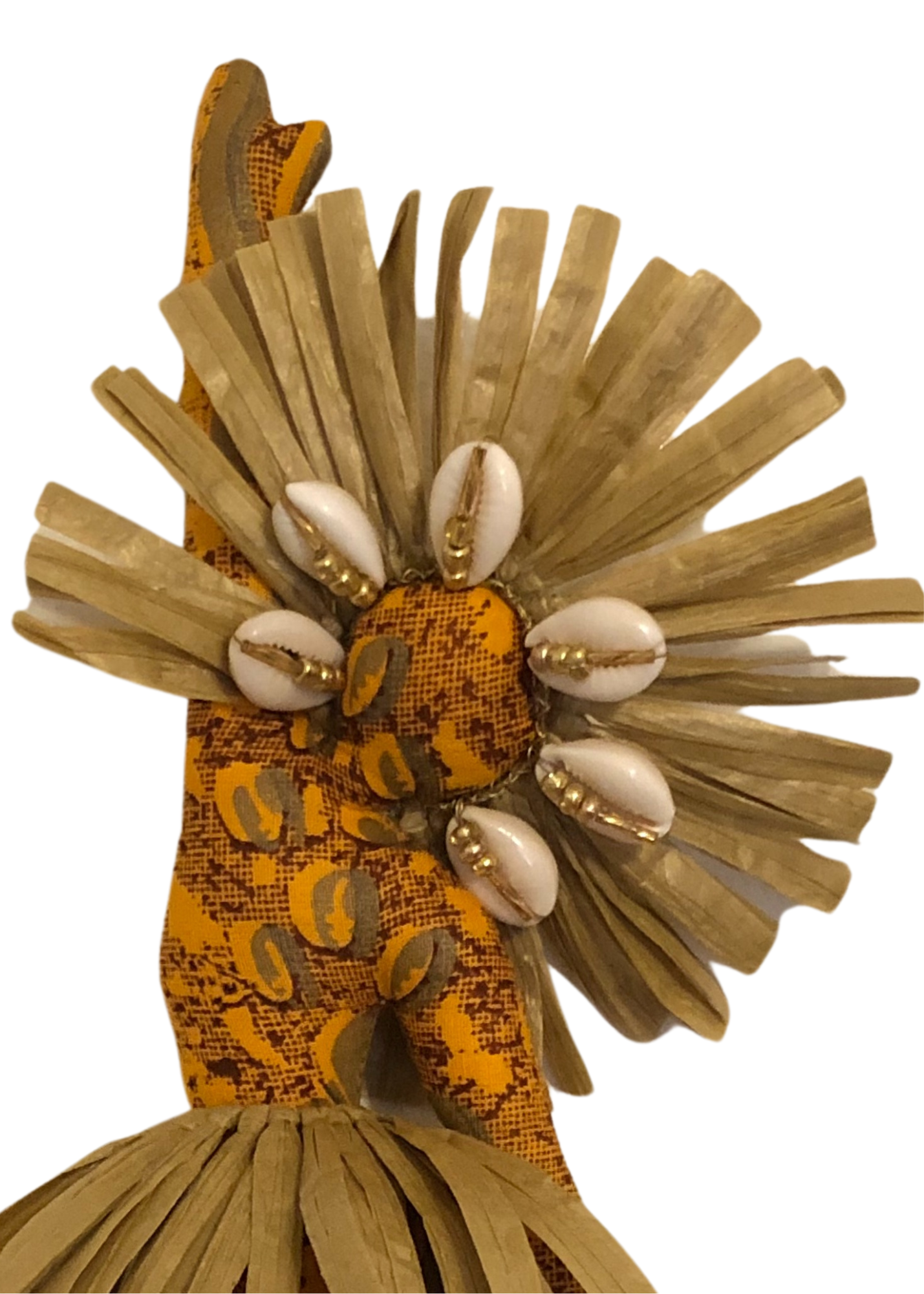 Each Hamida is lovingly handcrafted, adorned with a raffia crown accented by cowrie shells and seed beads — symbols of prosperity, sacred femininity, and ancient wisdom. Their flowing raffia skirts sway with movement, celebrating dance, culture, and the timeless beauty of Black womanhood.